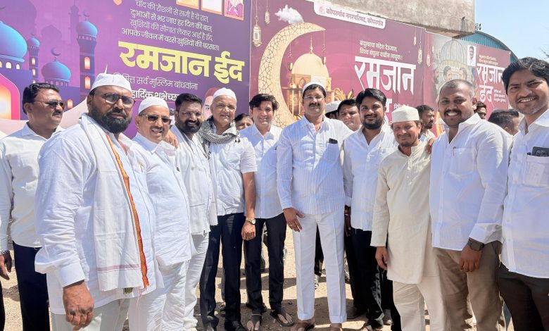 पवित्र रमजान महिनाभराच्या उपवासानंतर आज कोपरगाव शहरात रमजान ईदचा सण अत्यंत उत्साहात आणि आनंदी वातावरणात साजरा करण्यात आला. ईदनिमित्त नमाज पठण करण्यासाठी ईदगाह मैदानावर मुस्लिम बांधवांचा जनसागर उसळला होता. नमाज संपन्न झाल्यानंतर राष्ट्रवादी काँग्रेस पक्षाच्या प्रमुख पदाधिकाऱ्यांनी व कार्यकर्त्यांनी या ठिकाणी उपस्थित राहून सर्व मुस्लिम बांधवांची गळाभेट घेत त्यांना आमदार आशुतोष काळे यांच्या वतीने ईदच्या शुभेच्छा दिल्या. सामाजिक बांधिलकी जपतांना राष्ट्रवादीच्या पदाधिकाऱ्यांनी या सणाचा आनंद मुस्लिम बांधवांसोबत द्विगुणित केला याप्रसंगी राष्ट्रवादी काँग्रेस पक्षाचे आजी-माजी नगरसेवक, विविध सेलचे पदाधिकारी, कार्यकर्ते आणि मोठ्या संख्येने उपस्थित होते.